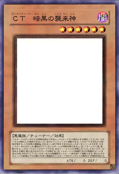 | このカードはデッキからの特殊召喚はできない。このカードをS素材とする場合、「CS」モンスターのS召喚にしか使用できない。①:自分メインフェイズに発動できる。このカードを手札から特殊召喚する。この効果の発動後、次のターン終了時まで自分はモンスターをリリースできず、Sモンスターまたはデッキ・墓地の「CT」モンスターしか特殊召喚できない。②:1ターンに1度、発動できる。このカードのレベルを1つ下げる。自分フィールドにS召喚した「CS」Sモンスターが存在する場合、更に自分は800LP回復する。③:このカードとの戦闘で自分が戦闘ダメージを受けた時、手札の「CT」モンスターまたは悪魔族モンスター1体を捨てて発動できる。受けたそのダメージの数値以下の攻撃力を持つ悪魔族モンスター1体をデッキから攻撃表示で特殊召喚する。 | |||