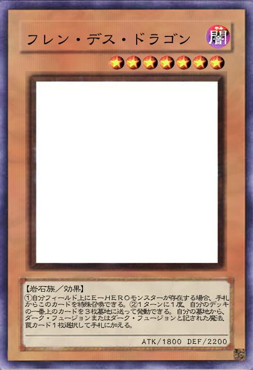 | ①自分フィールド上にEーHEROモンスターが存在する場合、手札からこのカードを特殊召喚できる。②1ターンに1度、自分のデッキの一番上のカードを3枚墓地に送って発動できる。自分の墓地から、ダーク・フュージョンまたはダーク・フュージョンと記された魔法、罠カード1枚選択して手札に加える。 | |||