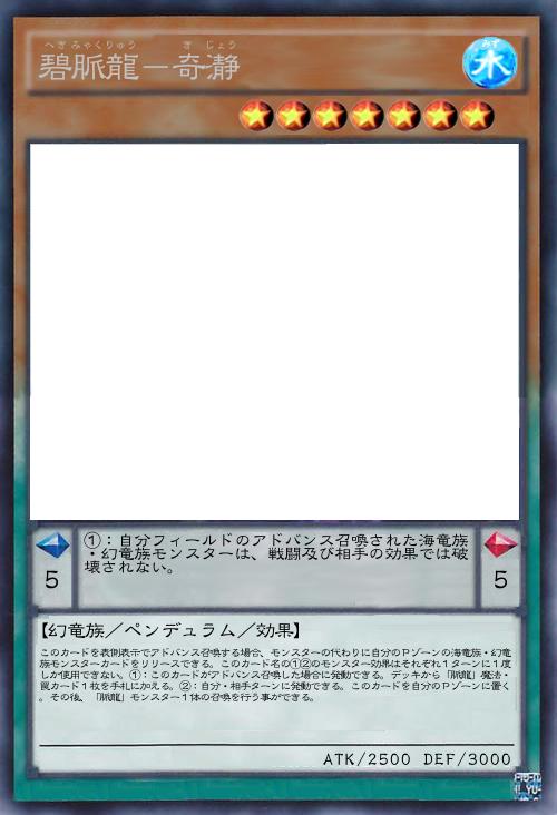 | このカードを表側表示でアドバンス召喚する場合、モンスターの代わりに自分のPゾーンの海竜族・幻竜族モンスターカードをリリースできる。このカード名の①②のモンスター効果はそれぞれ1ターンに1度しか使用できない。①:このカードがアドバンス召喚した場合に発動できる。デッキから「脈龍」魔法・罠カード1枚を手札に加える。②:自分・相手ターンに発動できる。このカードを自分のPゾーンに置く。その後、「脈龍」モンスター1体の召喚を行う事ができる。 | |||