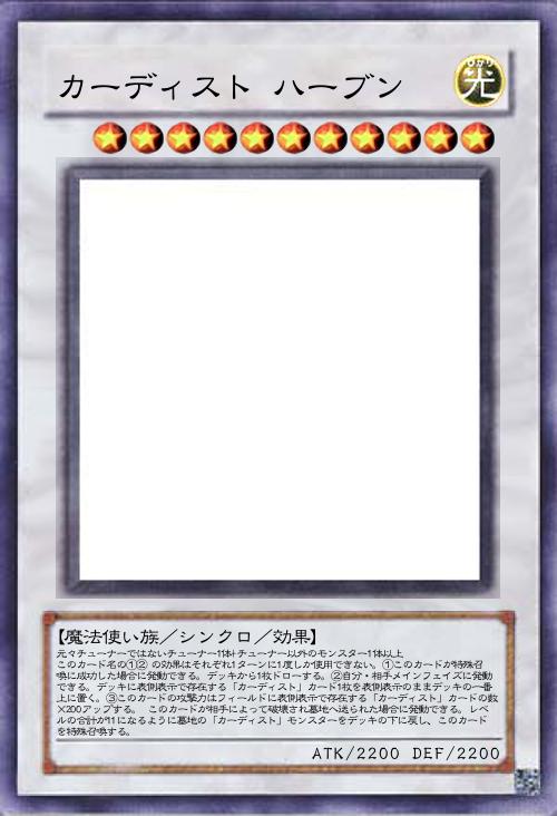 | 元々チューナーではないチューナー1体+チューナー以外のモンスター1体以上 このカード名の①②➃の効果はそれぞれ1ターンに1度しか使用できない。①このカードが特殊召喚に成功した場合に発動できる。デッキから1枚ドローする。②自分・相手メインフェイズに発動できる。デッキに表側表示で存在する「カーディスト」カード1枚を表側表示のままデッキの一番上に置く。③このカードの攻撃力はフィールドに表側表示で存在する「カーディスト」カードの数×200アップする。➃このカードが相手によって破壊され墓地へ送られた場合に発動できる。レベルの合計が11になるように墓地の「カーディスト」モンスターをデッキの下に戻し、このカードを特殊召喚する。 | |||