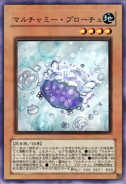 | ①:自分・相手ターンにこのカードを含む手札のモンスター2体を捨てて発動できる。このターン、以下を適用する。●自分の「マルチャミー」モンスターが自身のみを手札から捨てて発動する効果は自身がフィールドに存在する限り適用される効果になる。●相手が召喚・特殊召喚を行う度に自分の手札・墓地から「マルチャミー」モンスター1体を特殊召喚する。●「マルチャミー•プローチェ」が特殊召喚される度に自分はデッキから1枚ドローする。 | |||
