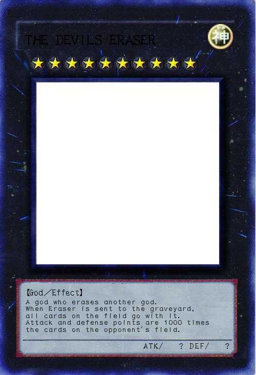 A god who erases another god. When Eraser is sent to the graveyard, all cards on the field go with it. Attack and defense points are 1000 times the cards on the opponent's field. |