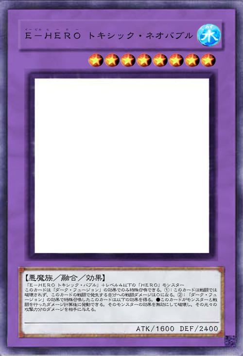 | 「E-HERO トキシック・バブル」+レベル4以下の「HERO」モンスター このカードは「ダーク・フュージョン」の効果でのみ特殊召喚できる。①:このカードは戦闘では破壊されず、このカードの戦闘で発生する自分への戦闘ダメージは0になる。②:「ダーク・フュージョン」の効果で特殊召喚したこのカードは以下の効果を得る。●このカードがモンスターと戦闘を行ったダメージ計算後に発動できる。そのモンスターの効果を無効にして破壊し、その元々の攻撃力分のダメージを相手に与える。 | |||