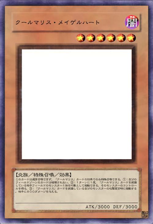 | このカードは通常召喚できず、「クールマリス」カードの効果でのみ特殊召喚できる。①:自分のフィールドゾーンのカードは破壊されない。②:1ターンに1度、「クールマリス」カードを装備している相手フィールドのモンスター1体を対象として発動できる。そのモンスターのコントロールを得る。③:「クールマリス」カードを装備している自分のモンスターの攻撃宣言時に発動する。相手に800ダメージを与える。 | |||