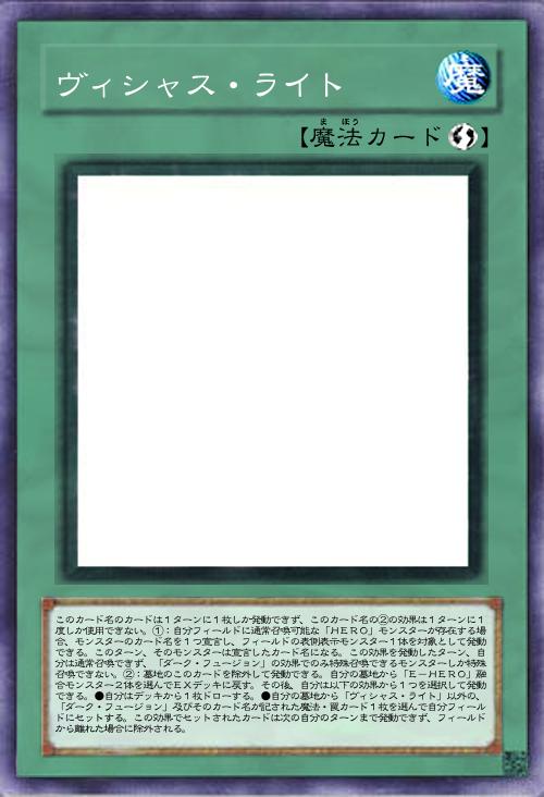 | このカード名のカードは1ターンに1枚しか発動できず、このカード名の②の効果は1ターンに1度しか使用できない。①:自分フィールドに通常召喚可能な「HERO」モンスターが存在する場合、モンスターのカード名を1つ宣言し、フィールドの表側表示モンスター1体を対象として発動できる。このターン、そのモンスターは宣言したカード名になる。この効果を発動したターン、自分は通常召喚できず、「ダーク・フュージョン」の効果でのみ特殊召喚できるモンスターしか特殊召喚できない。②:墓地のこのカードを除外して発動できる。自分の墓地から「E-HERO」融合モンスター2体を選んでEⅩデッキに戻す。その後、自分は以下の効果から1つを選択して発動できる。●自分はデッキから1枚ドローする。●自分の墓地から「ヴィシャス・ライト」以外の、「ダーク・フュージョン」及びそのカード名が記された魔法・罠カード1枚を選んで自分フィールドにセットする。この効果でセットされたカードは次の自分のターンまで発動できず、フィールドから離れた場合に除外される。 | |||