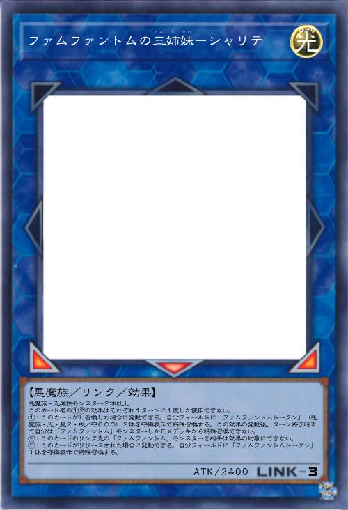 | 悪魔族・光属性モンスター2体以上 このカード名の①②の効果はそれぞれ1ターンに1度しか使用できない。 ①:このカードがL召喚した場合に発動できる。自分フィールドに「ファムファントムトークン」(悪魔族・光・星2・攻/守600)2体を守備表示で特殊召喚する。この効果の発動後、ターン終了時まで自分は「ファムファントム」モンスターしかEXデッキから特殊召喚できない。 ②:このカードのリンク先の「ファムファントム」モンスターを相手は効果の対象にできない。 ③:このカードがリリースされた場合に発動できる。自分フィールドに「ファムファントムトークン」1体を守備表示で特殊召喚する。 | |||
