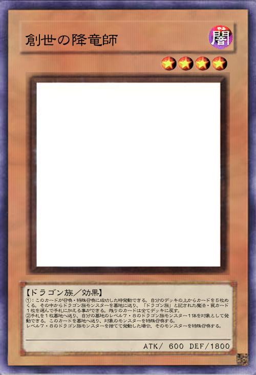 | ①:このカードが召喚・特殊召喚に成功した時発動できる。自分のデッキの上からカードを5枚めくる。その中からドラゴン族モンスターを墓地に送り、「ドラゴン族」と記された魔法・罠カード1枚を選んで手札に加える事ができる。残りのカードは全てデッキに戻す。 ②手札を1枚墓地へ送り、自分の墓地のレベル7・8のドラゴン族モンスター1体を対象として発動できる。このカードを墓地へ送り、対象のモンスターを特殊召喚する。 レベル7・8のドラゴン族モンスターを捨てて発動した場合、そのモンスターを特殊召喚する。 | |||