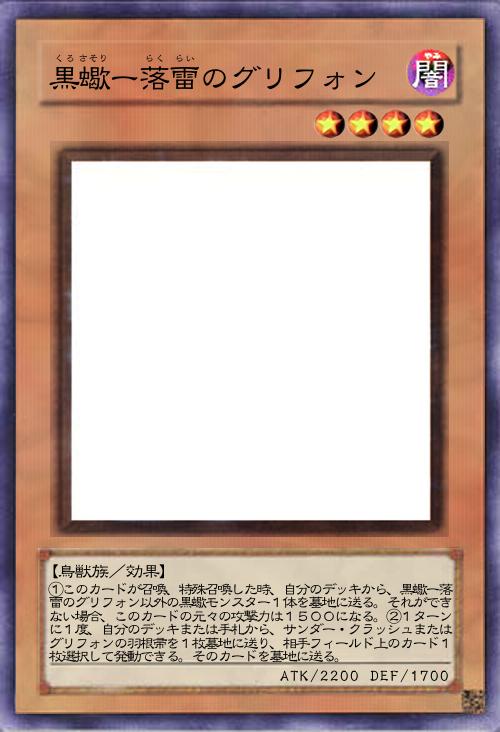 | ①このカードが召喚、特殊召喚した時、自分のデッキから、黒蠍ー落雷のグリフォン以外の黒蠍モンスター1体を墓地に送る。それができない場合、このカードの元々の攻撃力は1500になる。②1ターンに1度、自分のデッキまたは手札から、サンダー・クラッシュまたはグリフォンの羽根帚を1枚墓地に送り、相手フィールド上のカード1枚選択して発動できる。そのカードを墓地に送る。 | |||