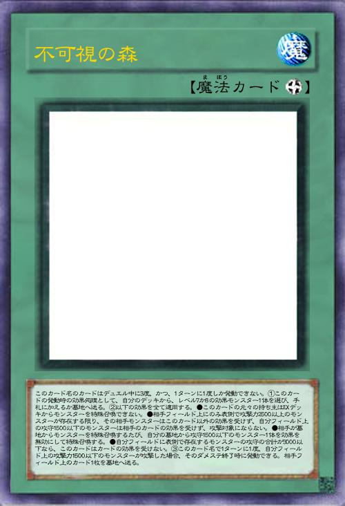 | このカード名のカードはデュエル中に3度、かつ、1ターンに1度しか発動できない。①このカードの発動時の効果処理として、自分のデッキから、レベル7か8の効果モンスター1体を選び、手札に加えるか墓地へ送る。②以下の効果を全て適用する。●このカードの元々の持ち主はEXデッキからモンスターを特殊召喚できない。●相手フィールド上にのみ表側で攻撃力2500以上のモンスターが存在する限り、その相手モンスターはこのカード以外の効果を受けず、自分フィールド上の攻守1500以下のモンスターは相手のカードの効果を受けず、攻撃対象にならない。●相手が墓地からモンスターを特殊召喚するたび、自分の墓地から攻守1500以下のモンスター1体を効果を無効にして特殊召喚する。●自分フィールドに表側で存在するモンスターの攻守の合計が3000以下なら、このカードはカードの効果を受けない。③このカード名で1ターンに1度、自分フィールド上の攻撃力1500以下のモンスターが攻撃した場合、そのダメステ終了時に発動できる。相手フィールド上のカード1枚を墓地へ送る。 | |||