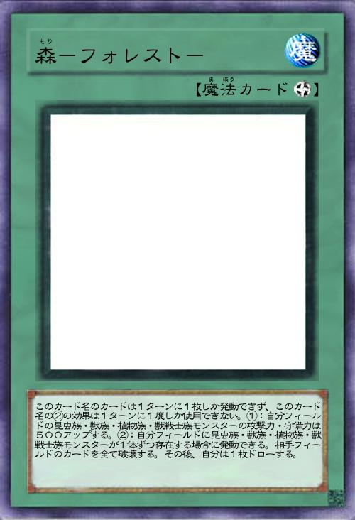 | このカード名のカードは1ターンに1枚しか発動できず、このカード名の②の効果は1ターンに1度しか使用できない。①:自分フィールドの昆虫族・獣族・植物族・獣戦士族モンスターの攻撃力・守備力は500アップする。②:自分フィールドに昆虫族・獣族・植物族・獣戦士族モンスターが1体ずつ存在する場合に発動できる。相手フィールドのカードを全て破壊する。その後、自分は1枚ドローする。 | |||