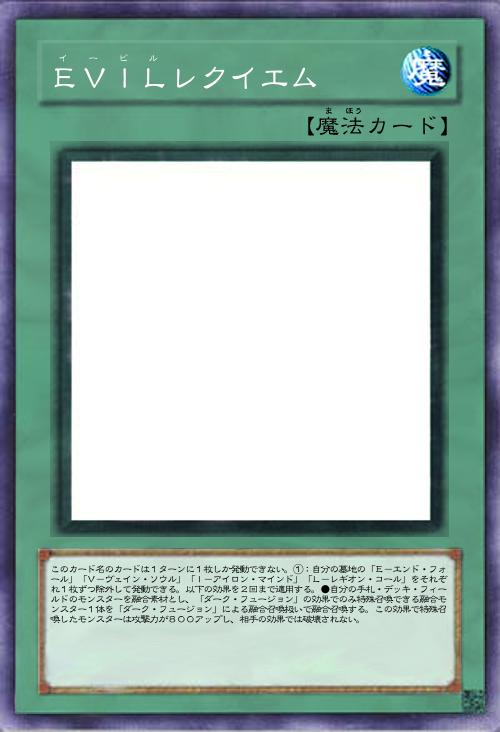 | このカード名のカードは1ターンに1枚しか発動できない。①:自分の墓地の「E-エンド・フォール」「V-ヴェイン・ソウル」「I-アイロン・マインド」「L-レギオン・コール」をそれぞれ1枚ずつ除外して発動できる。以下の効果を2回まで適用する。●自分の手札・デッキ・フィールドのモンスターを融合素材とし、「ダーク・フュージョン」の効果でのみ特殊召喚できる融合モンスター1体を「ダーク・フュージョン」による融合召喚扱いで融合召喚する。この効果で特殊召喚したモンスターは攻撃力が800アップし、相手の効果では破壊されない。 | |||