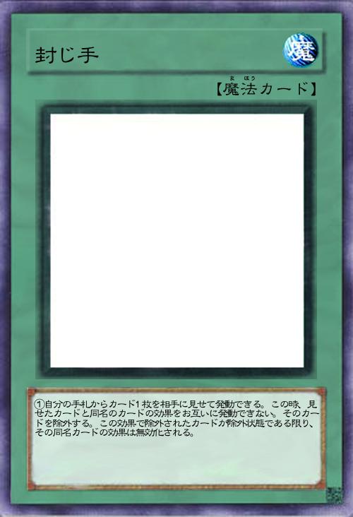 | ①自分の手札からカード1枚を相手に見せて発動できる。この時、見せたカードと同名のカードの効果をお互いに発動できない。そのカードを除外する。この効果で除外されたカードが除外状態である限り、その同名カードの効果は無効化される。 | |||