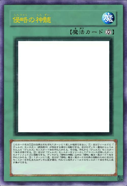 | このカード名の①②の効果はそれぞれ1ターンに1度しか使用できない。①:自分フィールドに「ヴェルズ」モンスター(表側表示)が存在する場合に発動できる。自分のデッキ・墓地からレベル5以上の「ヴェルズ」モンスター1体を手札に加える。その後、手札から「ヴェルズ」モンスター1体を召喚できる。②:自分が「ヴェルズ」モンスターをリリースしてアドバンス召喚したターンのメインフェイズに発動できる。デッキから「侵略の神髄」以外の「侵略」魔法・罠カード1枚を手札に加える。③:1ターンに1度、自分が「侵略」魔法・罠カードの効果の発動のために自分のモンスターを手札またはデッキに戻す場合、代わりに相手フィールドのモンスター1体を手札に戻す事ができる。 | |||