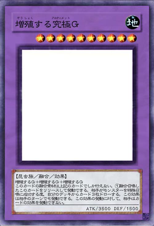 | 増殖するG+増殖するG+増殖するG このカードの融合素材は上記のカードでしか行えない。①融合召喚したこのカードをリリースして発動できる。相手がモンスターを特殊召喚に成功する度、自分のデッキからカード3枚ドローする。この効果は相手のターンでも発動できる。この効果の発動に対して、相手はカードの効果を発動できない。 | |||