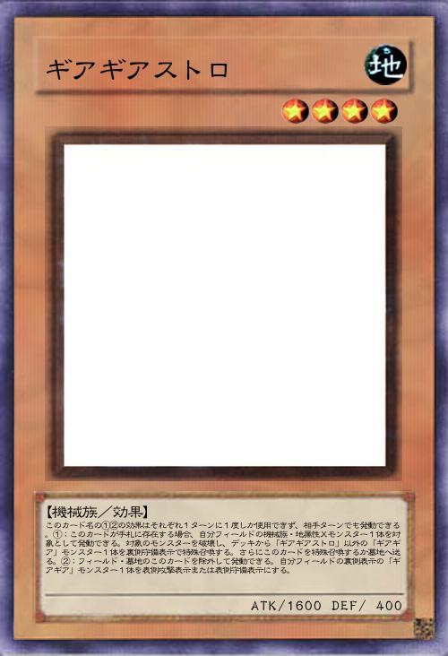 | このカード名の①②の効果はそれぞれ1ターンに1度しか使用できず、相手ターンでも発動できる。①:このカードが手札に存在する場合、自分フィールドの機械族・地属性Xモンスター1体を対象として発動できる。対象のモンスターを破壊し、デッキから「ギアギアストロ」以外の「ギアギア」モンスター1体を裏側守備表示で特殊召喚する。さらにこのカードを特殊召喚するか墓地へ送る。②:フィールド・墓地のこのカードを除外して発動できる。自分フィールドの裏側表示の「ギアギア」モンスター1体を表側攻撃表示または表側守備表示にする。 | |||