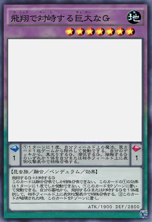 | 飛翔するG+対峙するG このカードは融合召喚でしか特殊召喚できない。このカードの①の効果は1ターンに1度でしか発動できない。①このカードをPゾーンに置いて発動できる。自分の墓地から、飛翔するGまたは対峙するGを1体選択して、相手フィールド上に表側攻撃表示で特殊召喚する。②このカードが破壊された時、このカードをPゾーンに置く。 | |||