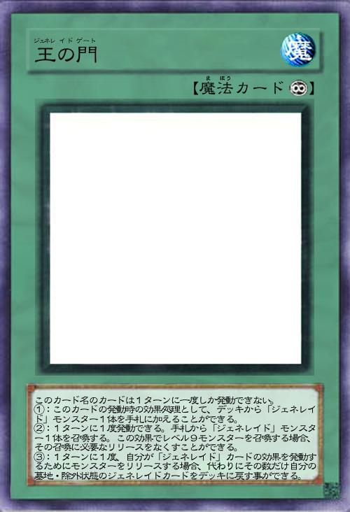 | このカード名のカードは1ターンに一度しか発動できない。 ①:このカードの発動時の効果処理として、デッキから「ジェネレイド」モンスター1体を手札に加えることができる。 ②:1ターンに1度発動できる。手札から「ジェネレイド」モンスター1体を召喚する。この効果でレベル9モンスターを召喚する場合、その召喚に必要なリリースをなくすことができる。 ③:1ターンに1度、自分が「ジェネレイド」カードの効果を発動するためにモンスターをリリースする場合、代わりにその数だけ自分の墓地・除外状態のジェネレイドカードをデッキに戻す事ができる。 | |||