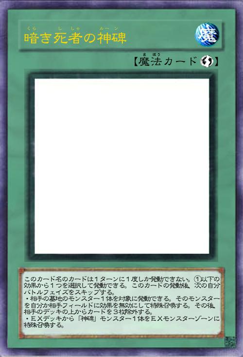 | このカード名のカードは1ターンに1度しか発動できない。①以下の効果から1つを選択して発動できる。このカードの発動後、次の自分バトルフェイズをスキップする。 ・相手の墓地のモンスター1体を対象に発動できる。そのモンスターを自分か相手フィールドに効果を無効にして特殊召喚する。その後、相手のデッキの上からカードを3枚除外する。 ・EXデッキから「神碑」モンスター1体をEXモンスターゾーンに特殊召喚する。 | |||