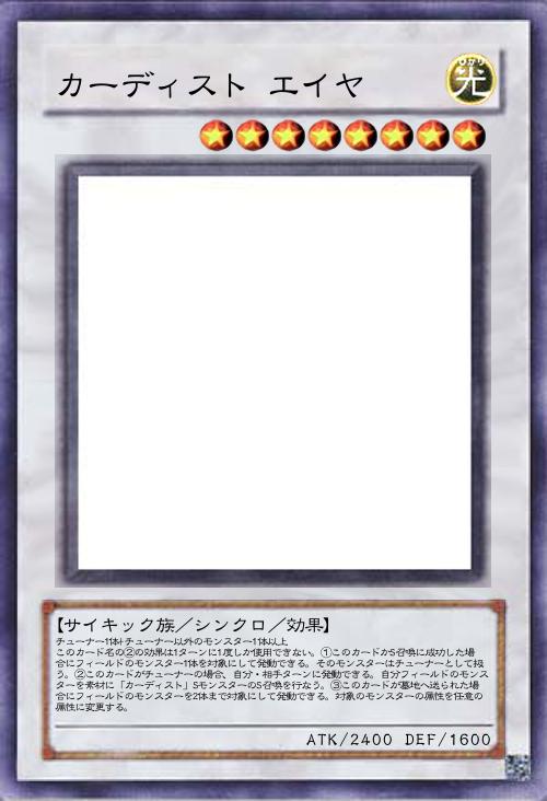 | チューナー1体+チューナー以外のモンスター1体以上 このカード名の②の効果は1ターンに1度しか使用できない。①このカードかS召喚に成功した場合にフィールドのモンスター1体を対象にして発動できる。そのモンスターはチューナーとして扱う。②このカードがチューナーの場合、自分・相手ターンに発動できる。自分フィールドのモンスターを素材に「カーディスト」SモンスターのS召喚を行なう。③このカードが墓地へ送られた場合にフィールドのモンスターを2体まで対象にして発動できる。対象のモンスターの属性を任意の属性に変更する。 | |||