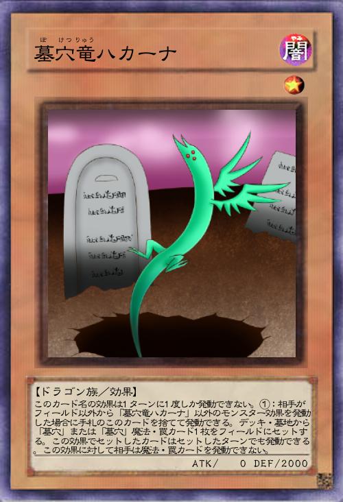 | このカード名の効果は1ターンに1度しか発動できない。①:相手がフィールド以外から「墓穴竜ハカーナ」以外のモンスター効果を発動した場合に手札のこのカードを捨てて発動できる。デッキ・墓地から「墓穴」または「墓穴」魔法・罠カード1枚をフィールドにセットする。この効果でセットしたカードはセットしたターンでも発動できる。この効果に対して相手は魔法・罠カードを発動できない。 | |||
