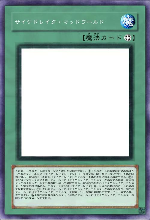 | このカード名のカードは1ターンに1度しか発動できない。①:このカードの発動時の効果処理として相手フィールドに「サイケドレイクトークン」(ドラゴン族・闇・星7・攻/守0)1体を特殊召喚し、自分のデッキから「サイケドレイク」モンスター1体を手札に加える事ができる。②:自分メインフェイズに1度、フィールドに「サイケドレイク」モンスターが存在する場合、自分のデッキの上からカードを3枚墓地へ送って発動できる。自分の手札から「サイケドレイク」モンスター1体を特殊召喚する。このターン自分は「サイケドレイク」カード以外の墓地のカードの効果を発動できない。③:互いのフィールドに「サイケドレイク」モンスターが存在する限り、相手はフィールドの「サイケドレイク」モンスターを融合・S・L召喚の素材にできず、リリースする事もできない。④:相手は自身のエンドフェイズ毎にフィールドの「サイケドレイク」モンスターの数×200ダメージを受ける。 | |||