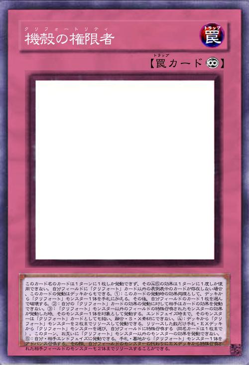 | このカード名のカードは1ターンに1枚しか発動できず、その④⑤の効果は1ターンに1度しか使用できない。自分フィールドに「クリフォート」カード以外の表側表示のカードが存在しない場合、このカードの発動はデッキからもできる。①:このカードの発動時の効果処理として、デッキから「クリフォート」モンスター1体を手札に加える。その後、自分フィールドのカード1枚を選んで破壊する。②:自分の「クリフォート」カードの効果の発動に対して相手はカードの効果を発動できない。③:「クリフォート」モンスター以外のフィールドの特殊召喚されたモンスターの効果が発動した時、そのモンスター1体を対象として発動する。エンドフェイズ時まで、そのモンスターは「クリフォート」カードとしても扱い、融合・S・X素材にできない。④:デッキから「クリフォート」モンスターを2枚までリリースして発動できる。リリースした数だけ手札・EXデッキから「クリフォート」モンスターを選び、自分フィールドに特殊召喚する(同名カードは1枚まで)。このターン、お互いに「クリフォート」モンスター以外のモンスターの効果を発動できない。⑤:自分・相手エンドフェイズに発動できる。手札・墓地から「クリフォート」モンスター1体をアドバンス召喚する。その際、自分フィールドのモンスターの代わりにEXデッキから特殊召喚された相手フィールドのモンスターも2体までリリースすることができる。 | |||