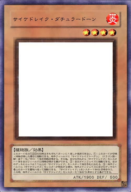 | このカード名の①②③の効果はそれぞれ1ターンに1度しか使用できない。①:このカードが召喚・特殊召喚した場合に発動できる。相手フィールドに「サイケドレイクトークン」(ドラゴン族・闇・星7・攻/守0)1体を特殊召喚する。その後、自分の手札から「サイケドレイク」モンスター1体を自分フィールドに特殊召喚する事ができる。②:自分メインフェイズに発動できる。自分のデッキからレベル11以上の「サイケドレイク」モンスター1体を手札に加える。③:相手フィールドに「サイケドレイク」モンスターが存在する場合、相手メインフェイズに自分のデッキの1番上のカードを墓地へ送って発動できる。「サイケドレイク」Lモンスター1体のL召喚を行う。この時、相手フィールドの「サイケドレイク」モンスターも1体までL素材とすろ事ができる。 | |||