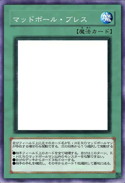| 自分フィールド上に元々のカード名がE・HEROマッドボールマンが存在する場合のみ発動できる。次の効果から1つ選択して発動する。 ●相手フィールド上のカードを全て破壊する。自分はこのターン、E・HEROマッドボールマン以外のモンスターを攻撃できない。 ●自分のデッキからカード3枚ドローする。 ●相手の手札を確認し、その中からカード1枚選択して墓地に送る。 | |||