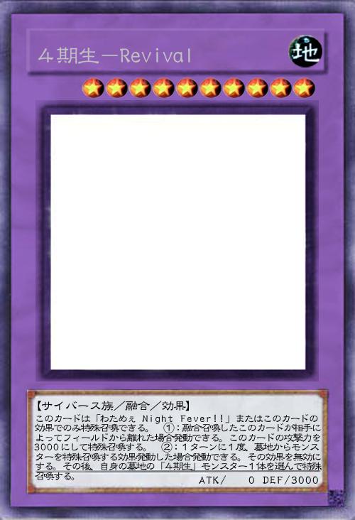 | このカードは「わためぇ Night Fever!!」またはこのカードの効果でのみ特殊召喚できる。 ①:融合召喚したこのカードが相手によってフィールドから離れた場合発動できる。このカードの攻撃力を3000にして特殊召喚する。 ②:1ターンに1度、墓地からモンスターを特殊召喚する効果発動した場合発動できる。その効果を無効にする。その後、自身の墓地の「4期生」モンスター1体を選んで特殊召喚する。 | |||