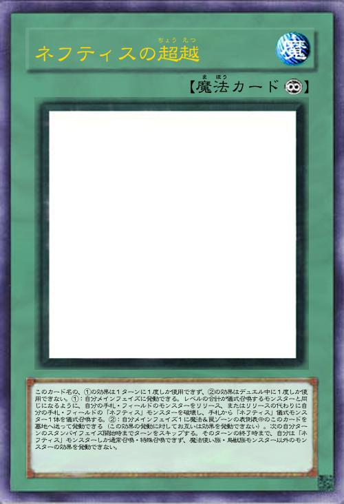 | このカード名の、①の効果は1ターンに1度しか使用できず、②の効果はデュエル中に1度しか使用できない。①:自分メインフェイズに発動できる。レベルの合計が儀式召喚するモンスターと同じになるように、自分の手札・フィールドのモンスターをリリース、またはリリースの代わりに自分の手札・フィールドの「ネフティス」モンスターを破壊し、手札から「ネフティス」儀式モンスター1体を儀式召喚する。②:自分メインフェイズ1に魔法&罠ゾーンの表側表示のこのカードを墓地へ送って発動できる(この効果の発動に対してお互いは効果を発動できない)。次の自分ターンのスタンバイフェイズ開始時までターンをスキップする。そのターンの終了時まで、自分は「ネフティス」モンスターしか通常召喚・特殊召喚できず、魔法使い族・鳥獣族モンスター以外のモンスターの効果を発動できない。 | |||