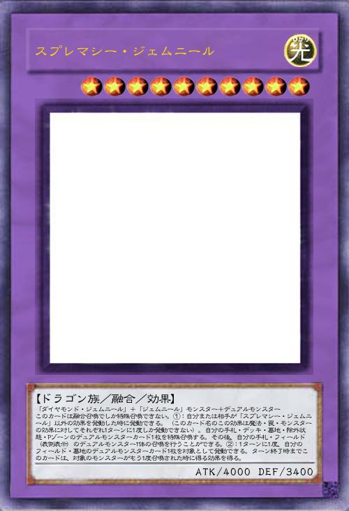 | 「ダイヤモンド・ジェムニール」+「ジェムニール」モンスター+デュアルモンスター このカードは融合召喚でしか特殊召喚できない。①:自分または相手が「スプレマシー・ジェムニール」以外の効果を発動した時に発動できる。(このカード名のこの効果は魔法・罠・モンスターの効果に対してそれぞれ1ターンに1度しか発動できない)。自分の手札・デッキ・墓地・除外状態・Pゾーンのデュアルモンスターカード1枚を特殊召喚する。その後、自分の手札・フィールド(表側表示)のデュアルモンスター1体の召喚を行うことができる。②:1ターンに1度、自分のフィールド・墓地のデュアルモンスターカード1枚を対象として発動できる。ターン終了時までこのカードは、対象のモンスターがもう1度召喚された時に得る効果を得る。 | |||