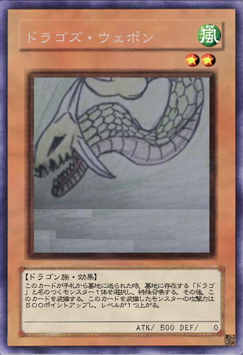 | このカードが手札から墓地に送られた時、墓地に存在する「ドラゴ」と名のつくモンスター1体を選択し、特殊召喚する。その後、このカードを装備する。このカードを装備したモンスターの攻撃力は500ポイントアップし、レベルが1つ上がる。 | |||