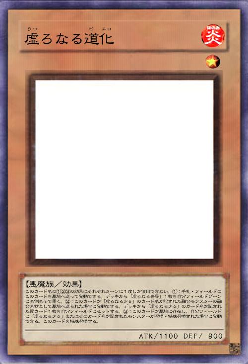 | このカード名の①②③の効果はそれぞれターンに1度しか使用できない。①:手札・フィールドのこのカードを墓地へ送って発動できる。デッキから「虚ろなる世界」1枚を自分フィールドゾーンに表側表示で置く。②:このカードが「虚ろなる少女」のカード名が記された融合モンスターの融合素材として墓地へ送られた場合に発動できる。デッキから「虚ろなる少女」のカード名が記された罠カード1枚を自分フィールドにセットする。③:このカードが墓地に存在し、自分フィールドに「虚ろなる少女」またはそのカード名が記されたモンスターが召喚・特殊召喚された場合に発動できる。このカードを特殊召喚する。 | |||