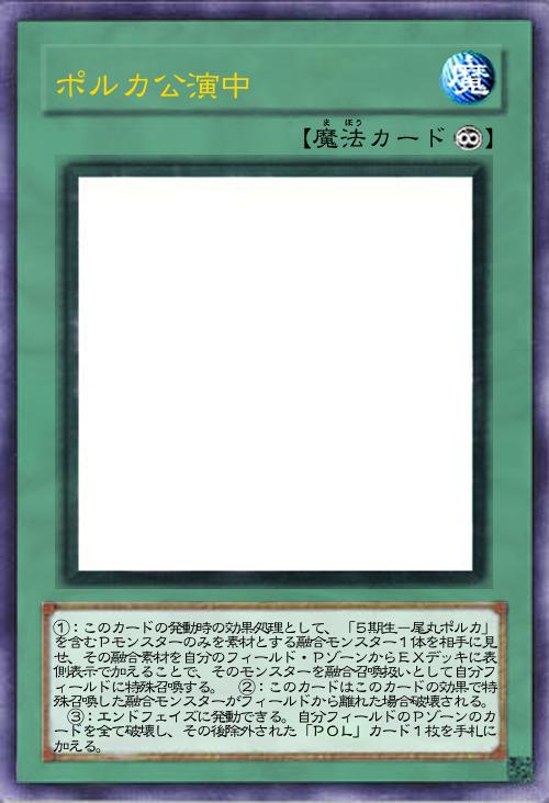 | ①:このカードの発動時の効果処理として、「5期生-尾丸ポルカ」を含むPモンスターのみを素材とする融合モンスター1体を相手に見せ、その融合素材を自分のフィールド・PゾーンからEXデッキに表側表示で加えることで、そのモンスターを融合召喚扱いとして自分フィールドに特殊召喚する。 ②:このカードはこのカードの効果で特殊召喚した融合モンスターがフィールドから離れた場合破壊される。 ③:エンドフェイズに発動できる。自分フィールドのPゾーンのカードを全て破壊し、その後除外された「POL」カード1枚を手札に加える。 | |||