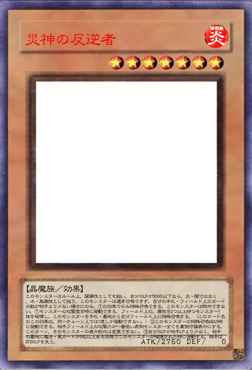 | このモンスターはルール上、闇属性としても扱い、自分のLPが3000以下なら、炎・闇ではなく、水・風属性として扱う。このモンスターは通常召喚できず、自分の手札・フィールド上のカードの数が相手より少ない場合にのみ、①の効果でのみ特殊召喚できる。このモンスターは除外できない。①モンスターの攻撃宣言時に発動できる。フィールド上の、属性を2つ以上持つモンスター1体を破壊し、このモンスターを手札・墓地から自分フィールド上に特殊召喚する。(このカード名のこの効果は、同一チェーン上では1度しか発動できない。)②このモンスターの特殊召喚成功時に発動できる。相手フィールド上の攻撃力が一番低い表側モンスター全てを裏側守備表示にする。このターン、そのモンスターの表示形式は変更できない。③自分のLPが相手LPより少なく、相手の墓地に魔法・罠カードが5枚以上ある状態でこのモンスターが破壊された時に発動する。相手は2750LPを失う。 | |||