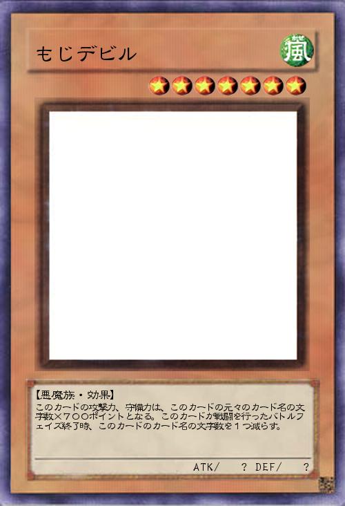 | このカードの攻撃力、守備力は、このカードの元々のカード名の文字数×700ポイントとなる。このカードが戦闘を行ったバトルフェイズ終了時、このカードのカード名の文字数を1つ減らす。 | |||