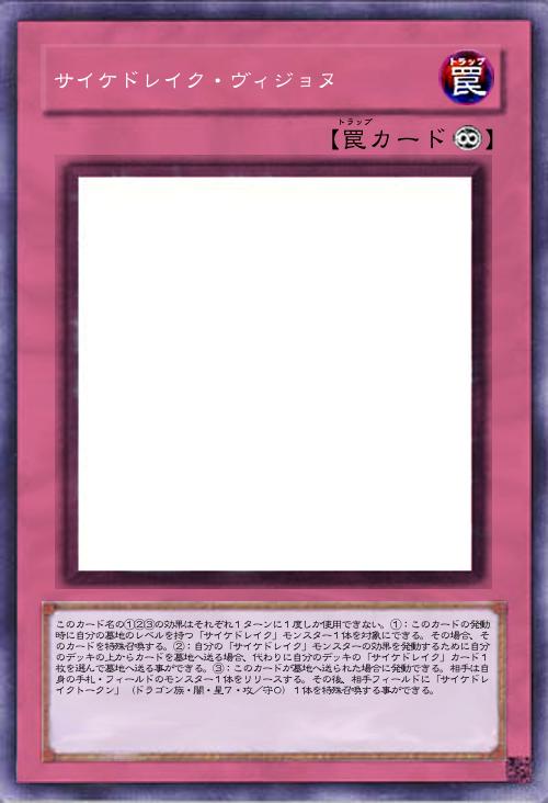| このカード名の①②③の効果はそれぞれ1ターンに1度しか使用できない。①:このカードの発動時に自分の墓地のレベルを持つ「サイケドレイク」モンスター1体を対象にできる。その場合、そのカードを特殊召喚する。②:自分の「サイケドレイク」モンスターの効果を発動するために自分のデッキの上からカードを墓地へ送る場合、代わりに自分のデッキの「サイケドレイク」カード1枚を選んで墓地へ送る事ができる。③:このカードが墓地へ送られた場合に発動できる。相手は自身の手札・フィールドのモンスター1体をリリースする。その後、相手フィールドに「サイケドレイクトークン」(ドラゴン族・闇・星7・攻/守0)1体を特殊召喚する事ができる。 | |||