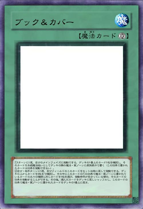 | ①1ターンに1度、自分のメインフェイズに発動できる。デッキの1番上のカード1枚を確認し、そのカードを永続魔法扱いとしてデッキの隣の魔法・罠ゾーンに表側表示で置く(この効果で置かれたカードは効果を発動できない)。 ②自分・相手ターンに1度、自分フィールドのこのカードをセット状態に戻して発動できる。デッキの上からカードを3枚まで確認し、その中にこのカードの①の効果で魔法・罠ゾーンに置かれているカードの元々の種類と同じカードを1枚を選び、発動条件が見合っている場合、そのカードの効果を発動することができる。その後、選んだカードをデッキに戻しシャッフルし、このカードの効果で魔法・罠ゾーンに置かれたカードをデッキの1番上に戻す。 | |||