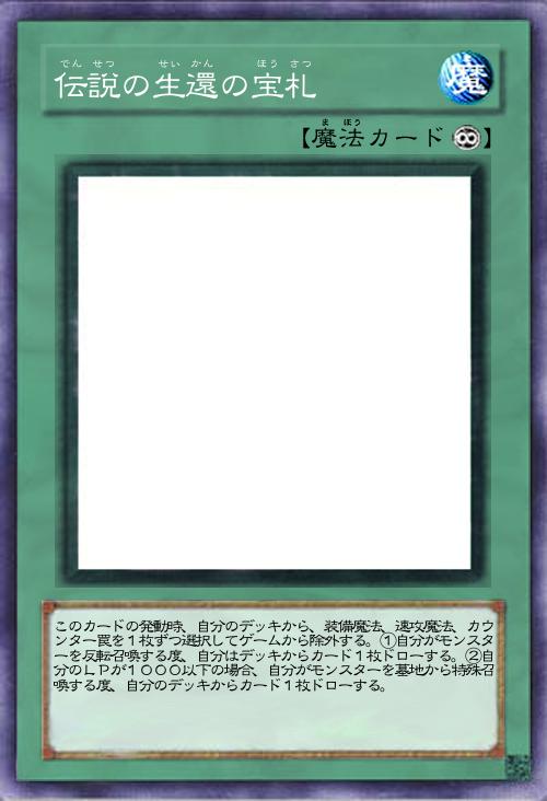 | このカードの発動時、自分のデッキから、装備魔法、速攻魔法、カウンター罠を1枚ずつ選択してゲームから除外する。①自分がモンスターを反転召喚する度、自分はデッキからカード1枚ドローする。②自分のLPが1000以下の場合、自分がモンスターを墓地から特殊召喚する度、自分のデッキからカード1枚ドローする。 | |||
