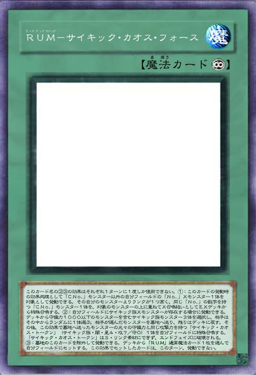 | このカード名の②③の効果はそれぞれ1ターンに1度しか使用できない。①:このカードの発動時の効果処理として「CNo.」モンスター以外の自分フィールドの「No.」Xモンスター1体を対象として発動できる。その自分のモンスターよりランクが1つ高く、同じ「No.」の数字を持つ「CNo.」モンスター1体を、対象のモンスターの上に重ねてX召喚扱いとしてEXデッキから特殊召喚する。②:自分フィールドにサイキック族Xモンスターが存在する場合に発動できる。デッキから守備力1000以下のモンスターを含むサイキック族モンスター3体を選択し、相手はその中からランダムに1体選ぶ。相手が選んだモンスターを墓地へ送り、残りはデッキに戻す。その後、この効果で墓地へ送ったモンスターの元々の守備力と同じ攻撃力を持つ「サイキック・カオス・トークン」(サイキック族・闇・星4・攻?/守0)1体を自分フィールドに特殊召喚する。「サイキック・カオス・トークン」はS・リンク素材にできず、エンドフェイズに破壊される。 ③:墓地のこのカードを除外して発動できる。デッキから「RUM」通常魔法カード1枚を選んで自分フィールドにセットする。この効果でセットしたカードは、このターン、発動できない。 | |||