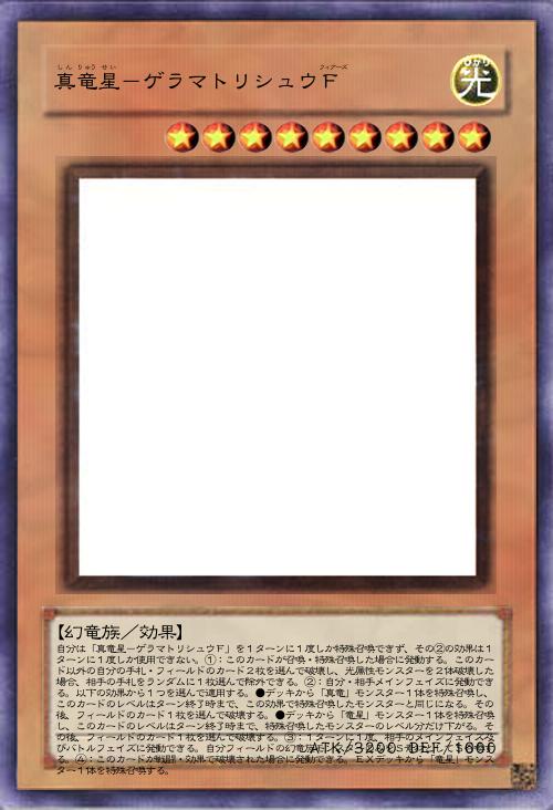 | 自分は「真竜星-ゲラマトリシュウF」を1ターンに1度しか特殊召喚できず、その②の効果は1ターンに1度しか使用できない。①:このカードが召喚・特殊召喚した場合に発動する。このカード以外の自分の手札・フィールドのカード2枚を選んで破壊し、光属性モンスターを2体破壊した場合、相手の手札をランダムに1枚選んで除外できる。②:自分・相手メインフェイズに発動できる。以下の効果から1つを選んで適用する。●デッキから「真竜」モンスター1体を特殊召喚し、このカードのレベルはターン終了時まで、この効果で特殊召喚したモンスターと同じになる。その後、フィールドのカード1枚を選んで破壊する。●デッキから「竜星」モンスター1体を特殊召喚し、このカードのレベルはターン終了時まで、特殊召喚したモンスターのレベル分だけ下がる。その後、フィールドのカード1枚を選んで破壊する。③:1ターンに1度、相手のメインフェイズ及びバトルフェイズに発動できる。自分フィールドの幻竜族モンスターのみをS素材としてS召喚する。④:このカードが戦闘・効果で破壊された場合に発動できる。EXデッキから「竜星」モンスター1体を特殊召喚する。 | |||