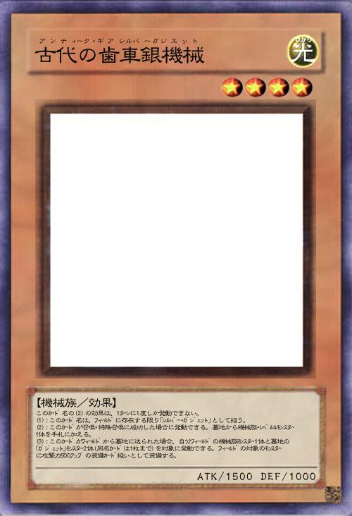 | このカード名の(2)の効果は、1ターンに1度しか発動できない。 (1):このカード名は、フィールドに存在する限り「シルバー・ガジェット」として扱う。 (2):このカードが召喚・特殊召喚に成功した場合に発動できる。墓地から機械族・レベル4モンスター1体を手札に加える。 (3):このカードがフィールドから墓地に送られた場合、自分フィールドの機械族モンスター1体と墓地の「ガジェット」モンスター2体(同名カードは1枚まで)を対象に発動できる。フィールドの対象のモンスターに攻撃力500アップの装備カード扱いとして装備する。 | |||