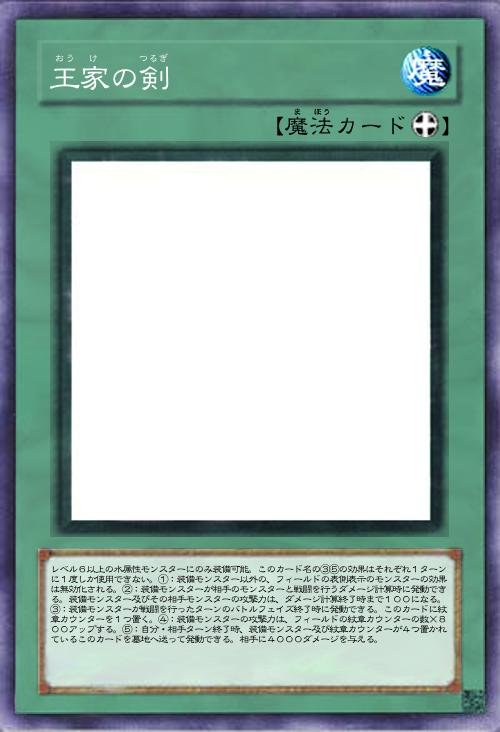 | レベル6以上の水属性モンスターにのみ装備可能。このカード名の③⑤の効果はそれぞれ1ターンに1度しか使用できない。①:装備モンスター以外の、フィールドの表側表示のモンスターの効果は無効化される。②:装備モンスターが相手のモンスターと戦闘を行うダメージ計算時に発動できる。装備モンスター及びその相手モンスターの攻撃力は、ダメージ計算終了時まで100になる。③:装備モンスターが戦闘を行ったターンのバトルフェイズ終了時に発動できる。このカードに紋章カウンターを1つ置く。④:装備モンスターの攻撃力は、フィールドの紋章カウンターの数×800アップする。⑤:自分・相手ターン終了時、装備モンスター及び紋章カウンターが4つ置かれているこのカードを墓地へ送って発動できる。相手に4000ダメージを与える。 | |||
