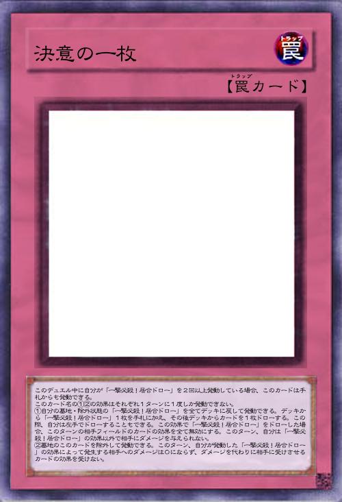 | このデュエル中に自分が「一撃必殺!居合ドロー」を2回以上発動している場合、このカードは手札からも発動できる。 このカード名の①②の効果はそれぞれ1ターンに1度しか発動できない。 ①自分の墓地・除外状態の「一撃必殺!居合ドロー」を全てデッキに戻して発動できる。デッキから「一撃必殺!居合ドロー」1枚を手札に加え、その後デッキからカードを1枚ドローする。この際、自分は左手でドローすることもできる。この効果で「一撃必殺!居合ドロー」をドローした場合、このターンの相手フィールドのカードの効果を全て無効にする。このターン、自分は「一撃必殺!居合ドロー」の効果以外で相手にダメージを与えられない。 ②墓地のこのカードを除外して発動できる。このターン、自分が発動した「一撃必殺!居合ドロー」の効果によって発生する相手へのダメージは0にならず、ダメージを代わりに相手に受けさせるカードの効果を受けない。 | |||