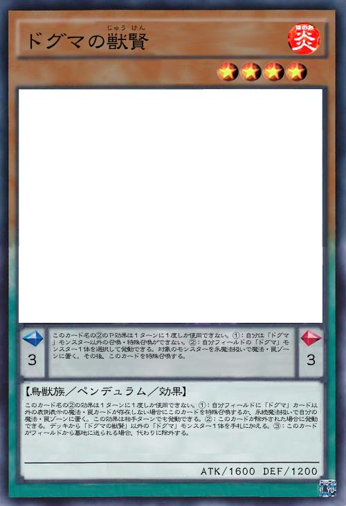 | このカード名の②の効果は1ターンに1度しか使用できない。①:自分フィールドに「ドグマ」カード以外の表側表示の魔法・罠カードが存在しない場合にこのカードを特殊召喚するか、永続魔法扱いで自分の魔法・罠ゾーンに置く。この効果は相手ターンでも発動できる。②:このカードが除外された場合に発動できる。デッキから「ドグマの獣賢」以外の「ドグマ」モンスター1体を手札に加える。③:このカードがフィールドから墓地に送られる場合、代わりに除外する。 | |||