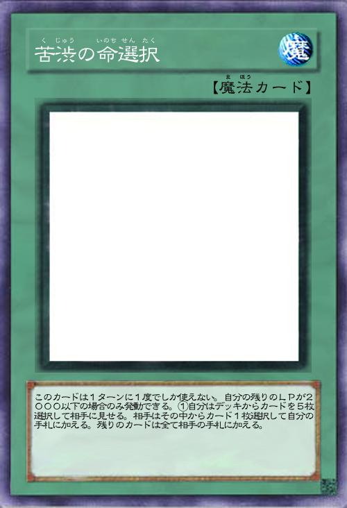 「苦渋の選択のリメイク版。ライフが2000以下でないと使えないが、あの禁止カードである苦渋の選択を発動してる感じになるが、残りは相手の手札になってしまう。」(2024-09-08 15:42)