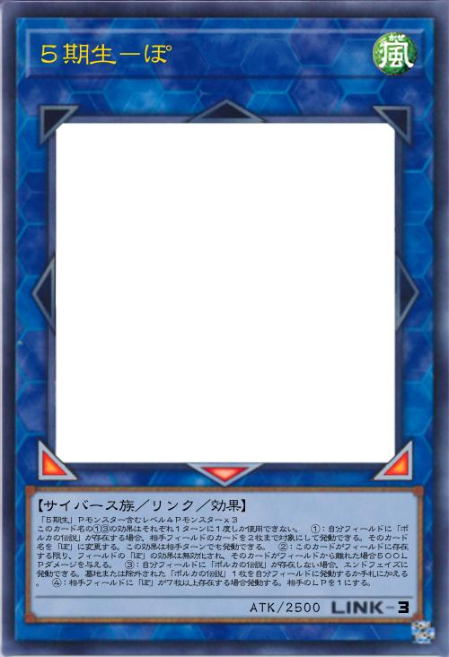 | 「5期生」Pモンスター含むレベル4Pモンスターx3 このカード名の①③の効果はそれぞれ1ターンに1度しか使用できない。 ①:自分フィールドに「ポルカの伝説」が存在する場合、相手フィールドのカードを2枚まで対象にして発動できる。そのカード名を「ぽ」に変更する。この効果は相手ターンでも発動できる。 ②:このカードがフィールドに存在する限り、フィールドの「ぽ」の効果は無効化され、そのカードがフィールドから離れた場合500LPダメージを与える。 ③:自分フィールドに「ポルカの伝説」が存在しない場合、エンドフェイズに発動できる。墓地または除外された「ポルカの伝説」1枚を自分フィールドに発動するか手札に加える。 ④:相手フィールドに「ぽ」が7枚以上存在する場合発動する。相手のLPを1にする。 | |||
