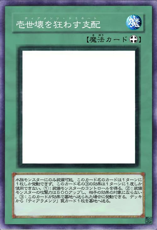 | 水族モンスターにのみ装備可能。このカード名のカードは1ターンに1枚しか発動できず、このカード名の③の効果は1ターンに1度しか使用できない。①:装備モンスターのコントロールを得る。②:装備モンスターの攻撃力は500アップし、相手の効果の対象にならない。③:このカードが効果で墓地へ送られた場合に発動できる。デッキから「ティアラメンツ」罠カード1枚を墓地へ送る。 | |||