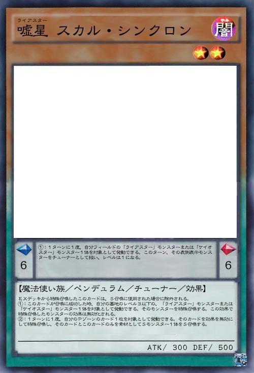 | EXデッキから特殊召喚したこのカードは、S召喚に使用された場合に除外される。 ①:このカードが召喚に成功した時、自分の墓地のレベル3以下の、「ライアスター」モンスターまたは「ケイオスター」モンスター1体を対象として発動できる。そのモンスターを特殊召喚する。この効果で特殊召喚したモンスターの効果は無効化される。 ②:1ターンに1度、自分のPゾーンのカード1枚を対象として発動できる。そのカードを効果を無効にして特殊召喚し、そのカードとこのカードのみを素材としてSモンスター1体をS召喚する。 | |||