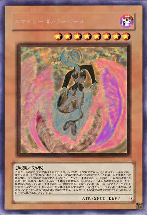 | このカード名の①②の効果はそれぞれ1ターンに1度しか使用できない。①:自分フィールドに通常モンスターが下に重ねられたモンスターが存在する場合に発動できる。このカードを手札から特殊召喚し、自分の墓地に存在する「スマイリーキング」1体を選択し、このカード以外の通常モンスターが下に重ねられたモンスター1体の下に重ねる。②:自分フィールドの通常モンスターが下に重ねられたモンスター1体を選択し、発動できる。そのモンスターの下に「スマイリーキング」を含む「スマイリー」モンスターが2体以上存在する場合、「スマイリー」モンスターまたは、通常モンスターを任意の枚数選択し特殊召喚する。このカード名の②の効果で特殊召喚されたモンスターの攻撃力は300アップする。 | |||